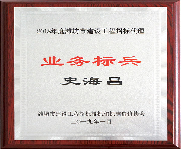 2018年度潍坊市建设工程招投标业务标兵史海昌牌匾