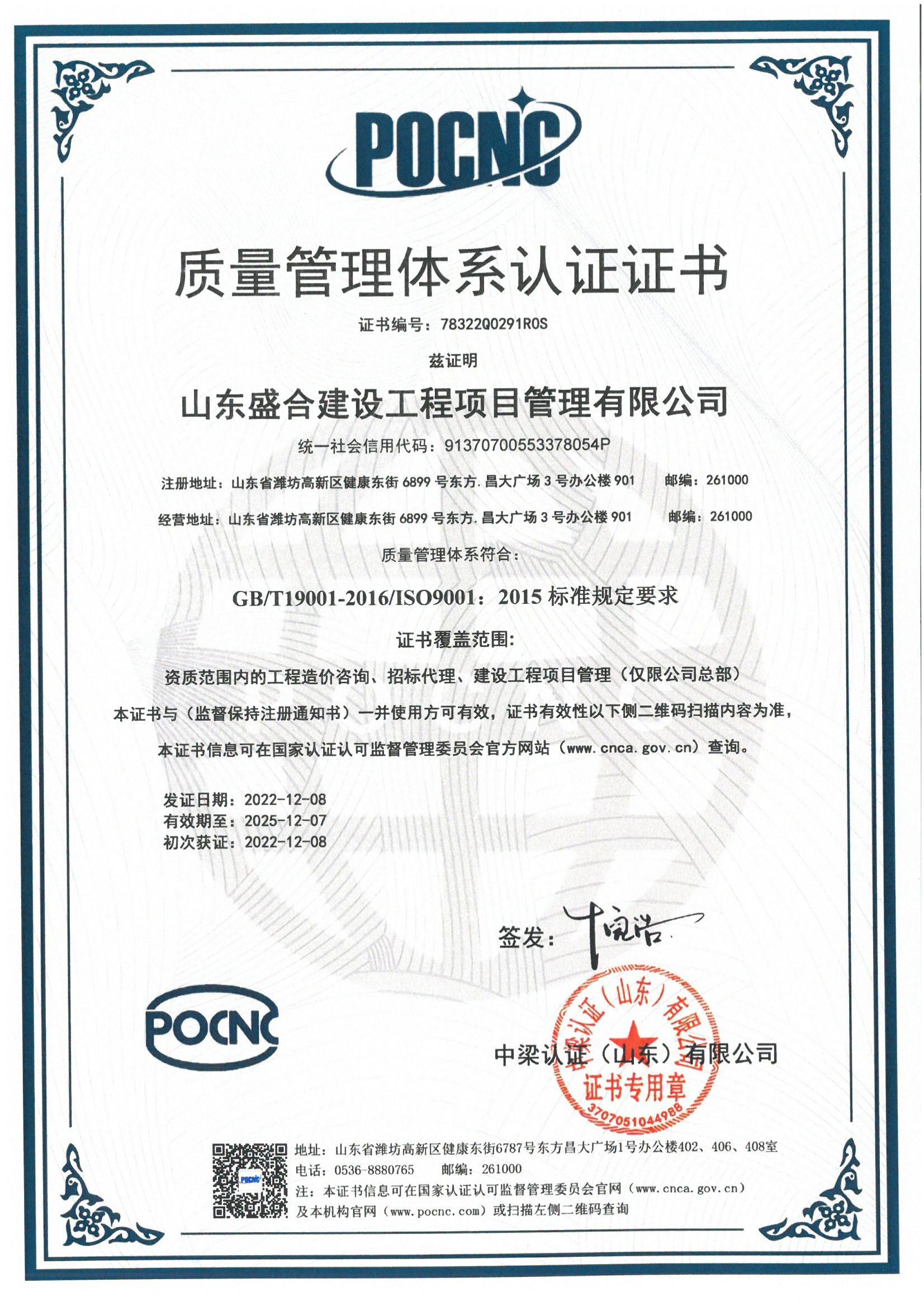 质量管理体系认证证书